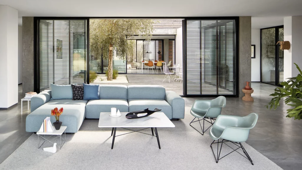 The interiors of the Eames Home reveal a balance between minimalism and warmth. The open-plan layout encourages interaction between spaces, with light flooding in through large glass walls. The use of color, texture, and eclectic objects gives the home its distinctive personality.