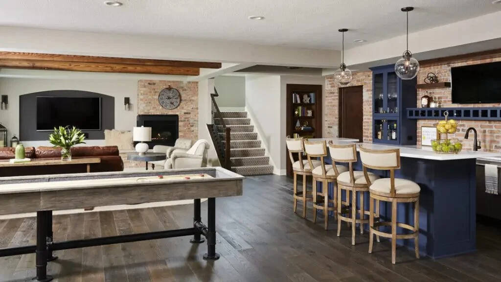 Basements often become the central location for entertainment, and the modern farmhouse style enhances this role. Large sectional sofas, a rustic bar, and media setups allow families to gather comfortably while enjoying the rustic-modern blend.